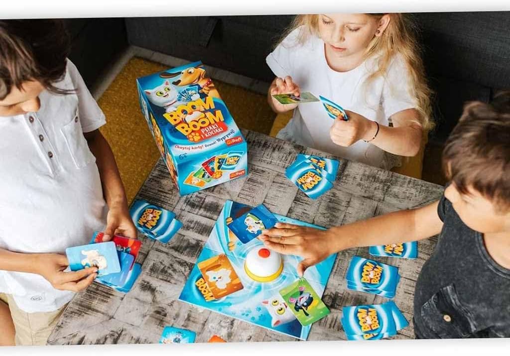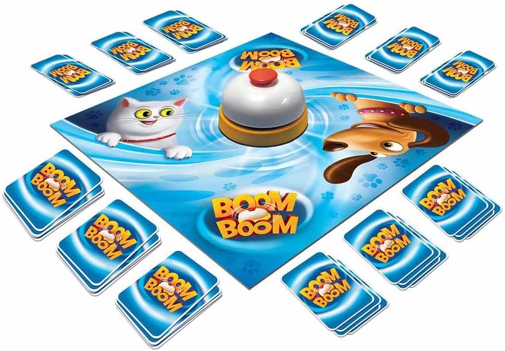 In Boom Boom, players complete sets of the same dogs and kittens. Everyone exchanges the cards of their hand with the cards in the board at the same time. After collecting a deck of four cards, the player rings the bell to signify that the task has been completed. Players can search for cards of the same type, which makes the gameplay even more exciting. The winner of the game is the person who collects all the necessary cards first.