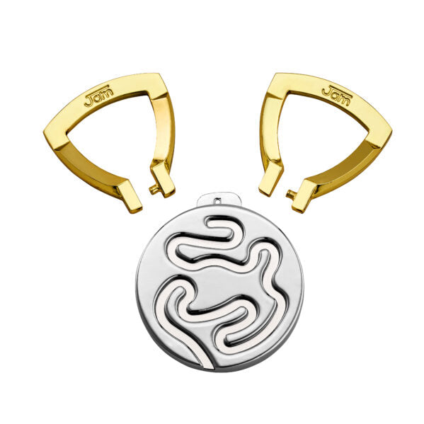 Two rings glide freely along paths on a flat round disk. Each attempt to separate them leads to one blocking the other. Explore the winding routes on both sides and find the breakthrough that will set them free. Designed by Japanese puzzle artist Yuu Asaka.