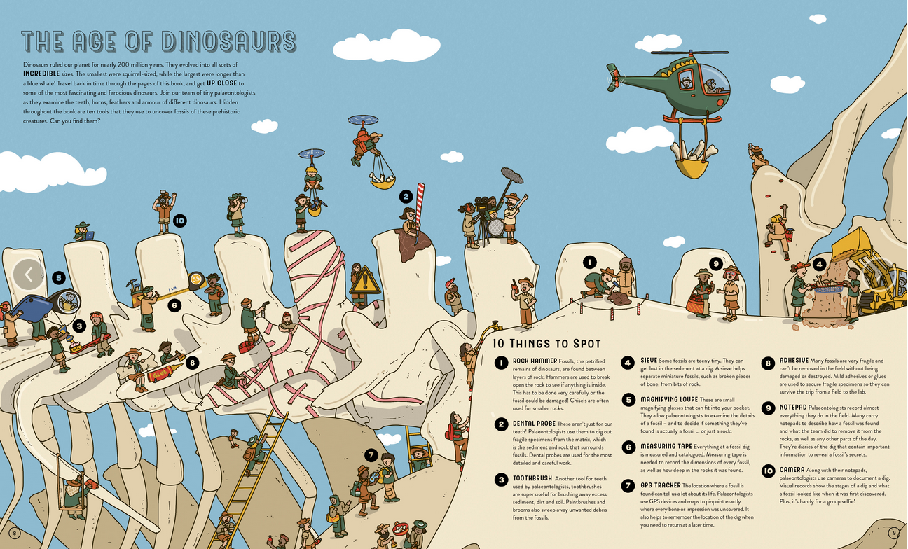 In this scientific search-and-find adventure, you’ll join a team of tiny palaeontologists as they explore an array of dinosaurs, living and fossilised, inside and out, from T. rex's teeth to Velociraptor's terrible toes. You’ll learn along the way how, where and when these dinosaurs lived, what they ate, who had feathers and who had scales – and of course, what it would be like to see dinosaurs UP CLOSE!