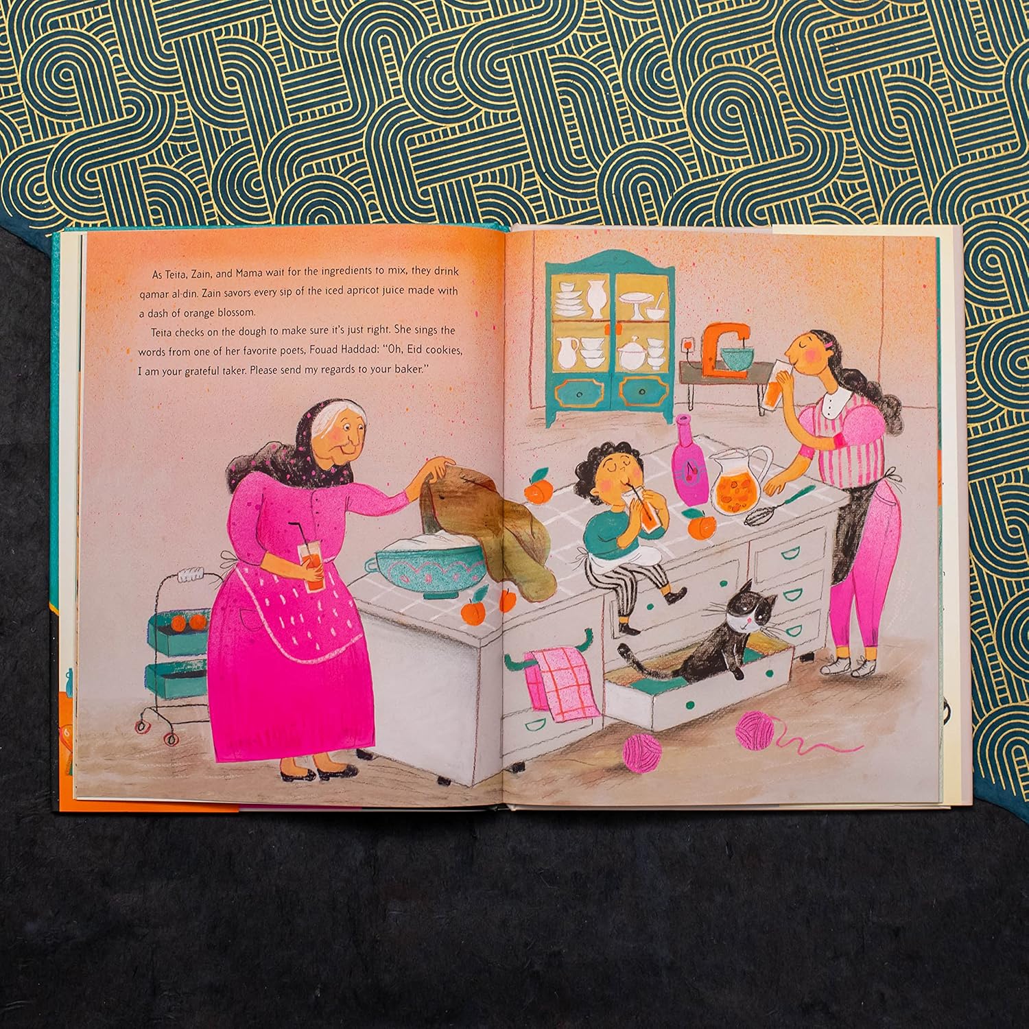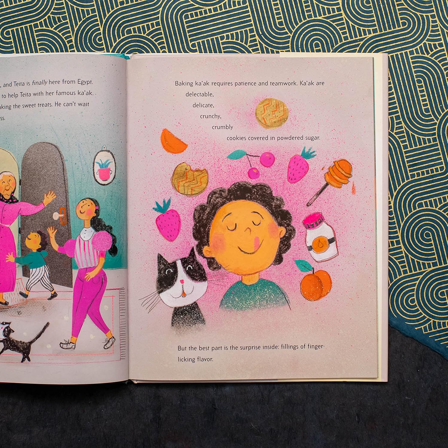 On the night before Eid, it’s finally time to make special sweet treats: Teita’s famous ka’ak. Zain eagerly unpacks the ingredients from his grandmother’s bulky suitcase: ghee from Khalo Karim, dates from Amo Girgis, and honey from Tant Tayseer-precious flavors all the way from Egypt. Together with Mama and Teita, Zain follows his family’s recipe and brings to life Eid songs and prayers, pharaonic history, and the melodies and tastes of his Egyptian heritage This Muslim holiday story, featuring a delicious ka’ak recipe, is a satisfying addition to a joyful and expansive Eid.
