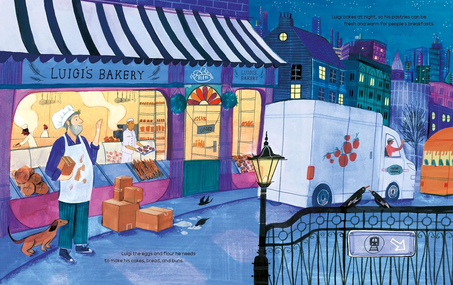 The sky is getting dark. In the city, a little girl is eating her dinner, brushing her teeth, and getting ready for bed. Meanwhile, her mother is putting on her coat and getting ready to go to work. Where is she going and who will she see along the way? As the night goes on, readers will see nurses, cleaners, delivery workers, doctors, police officers, journalists, and many other workers who help keep the city running all through the night.