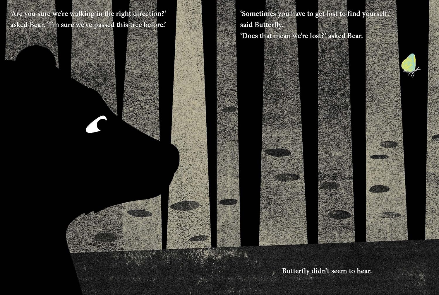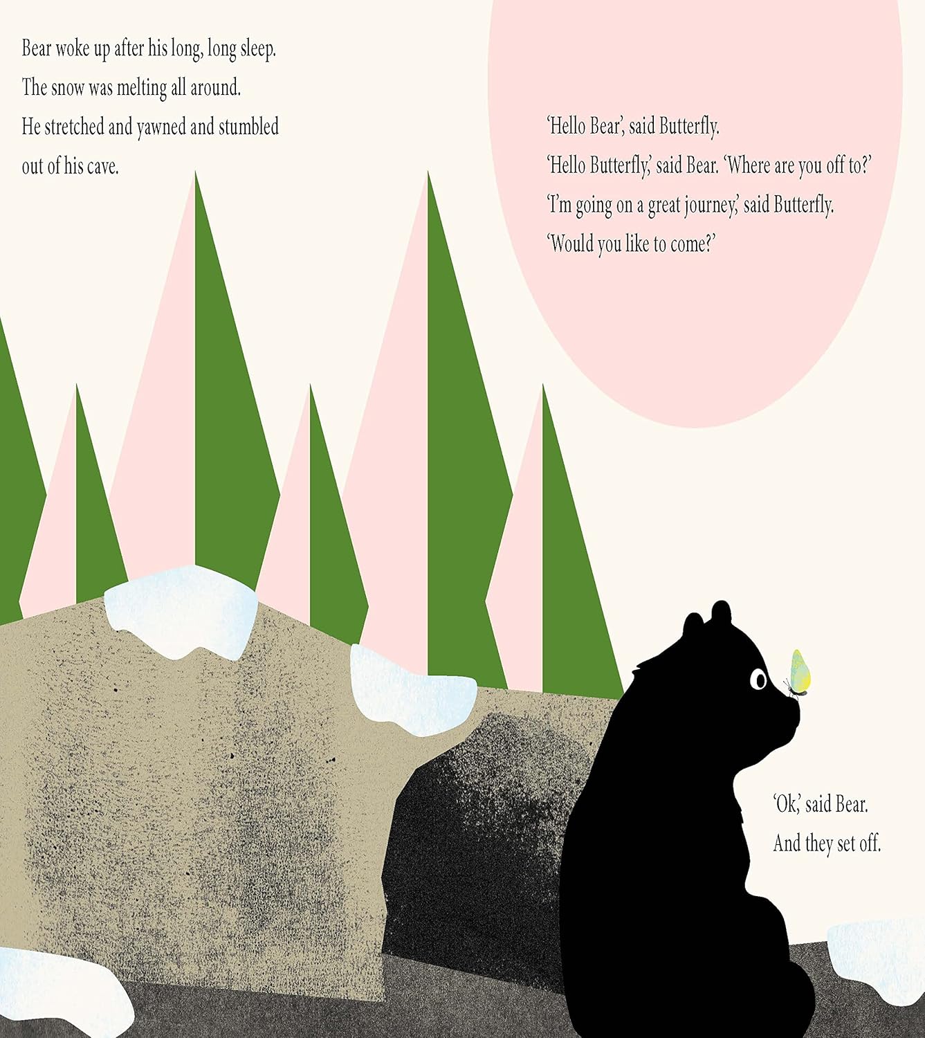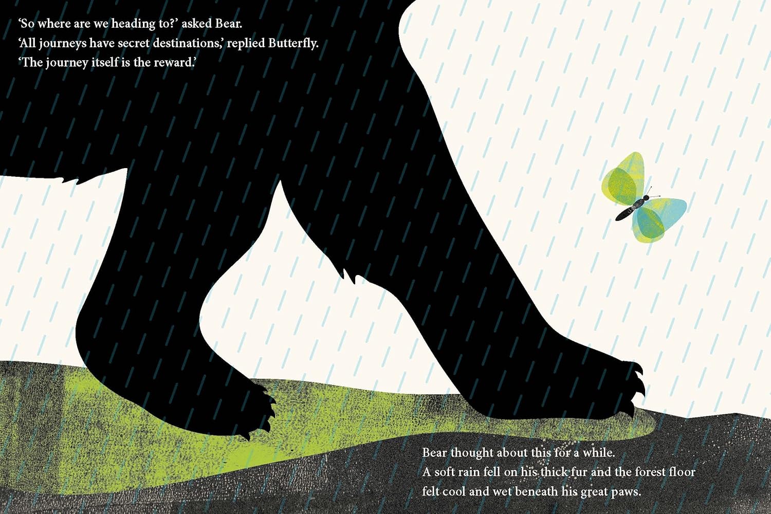 Bear wakes up after his long winter’s sleep and joins his friend, Butterfly, on a journey. 'Where are we going?' asks bear. 'All journeys have secret destinations', says Butterfly. As they travel through forest, over hill and across a great river, Butterfly offers her wisdom about hardships, facing one’s fears and living in the moment. Bear’s natural impatience gradually softens into acceptance of the world around him. As the seasons change, the friends find themselves once more in front of Bear’s cave. Landscapes look different with different eyes and the end of one journey is the beginning of another.